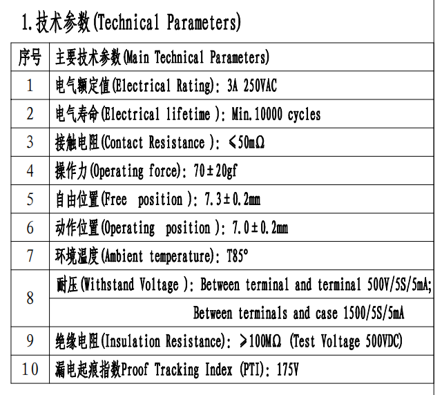 மைக்ரோ ஸ்விட்ச் அளவுரு (விவரக்குறிப்பு)